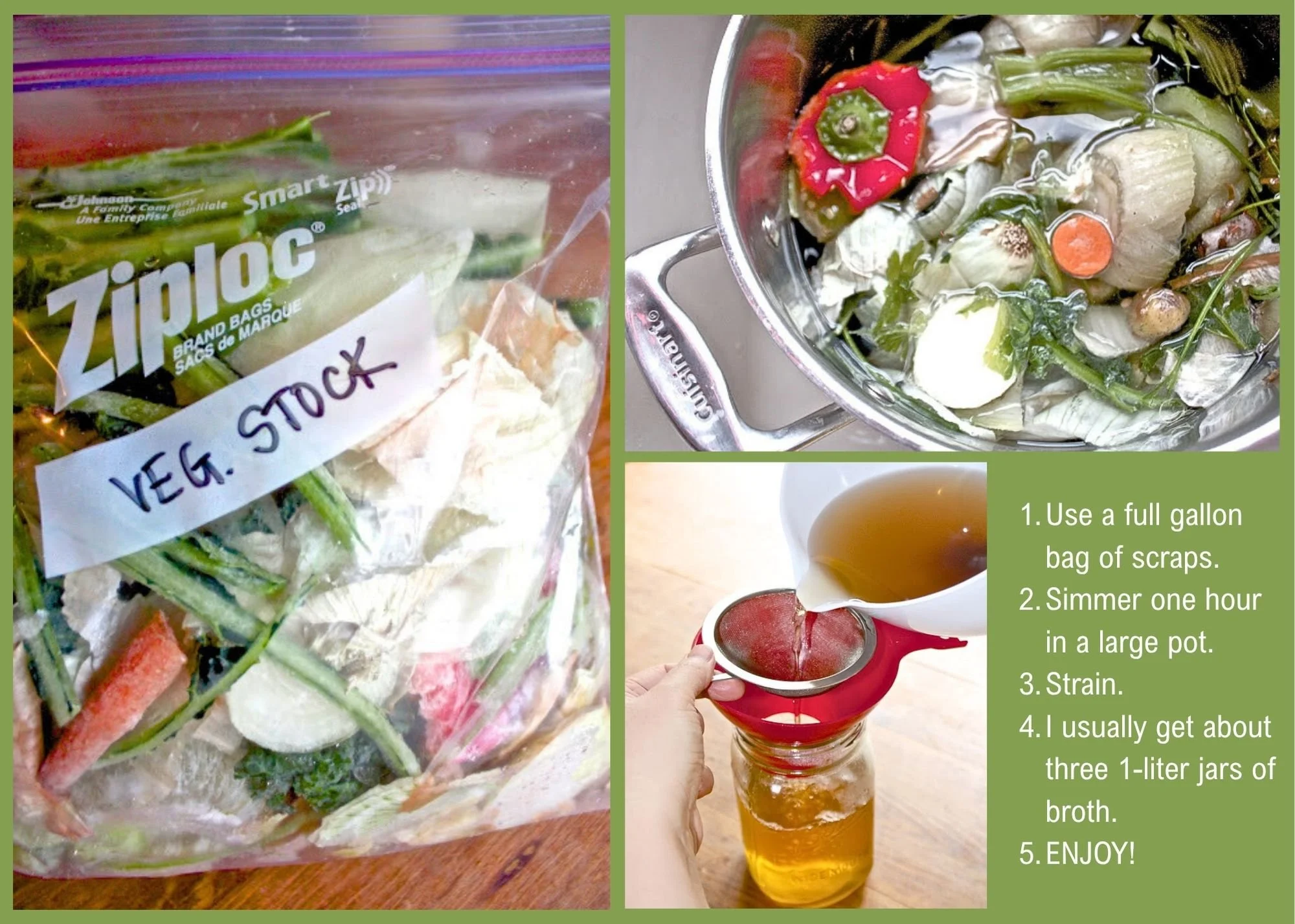 There is really no recipe. Just simmer your scraps in pure water, covered, on low for about an hour. Don’t forget the secret ingredient! (💗). After the mixture is cool enough to handle but still warm, strain it into mason jars. I like to jar it when the broth is still quite warm because the jars will then self-seal as they cool and the broth will stay fresh longer. Refrigerate and use for whatever calls for stock. ENJOY!
